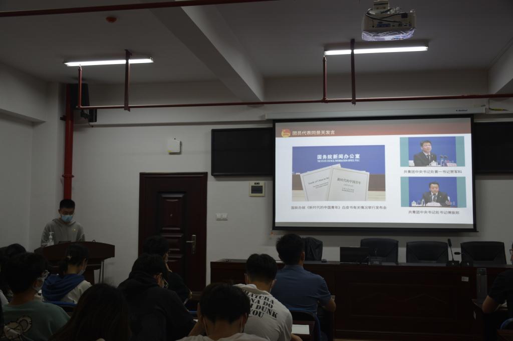 活动伊始,全体起立,奏唱团歌。随后,陈鑫林以“学习百年团史,凝聚奋进力量”为主题讲授专题团课,他从共青团的诞生背景、共青团的发展历史以及新时代的青年团员如何担当作为三个方面开始授课。首先,陈鑫林介绍了共青团成立时的社会背景,他指出在新文化运动和五四运动的影响下,广大进步青年要求改造社会的呼声响彻祖国大地,各地青年纷纷成立社团,探索救亡图存之路。在此背景下,1922年5月5日,在党的领导下,正式成立了中国社会主义青年团。随后,陈鑫林介绍了共青团的发展历史,在共青团的百年历程中,团组织经过中国社会主义青年团、中国共产主义青年团、中国新民主主义青年团等多个发展阶段,但不管在哪个阶段,中国青年始终坚定不移跟党走,为中国革命、建设和改革贡献了青年智慧、青年担当和青年力量。最后,陈鑫林为同学们解读了习近平总书记在纪念五四运动一百周年大会上对青年的寄语,希望同学们树立远大理想,热爱伟大祖国,担当时代责任,勇于砥砺奋斗,练就过硬本领,锤炼品德修为,积极投身实现中华民族伟大复兴中国梦的伟大实践,拥抱新时代、奋进新时代。