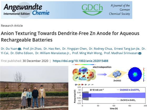 近日,威尼斯官网湖南省团队百人计划核心成员、湖湘学者、88038威尼斯材料学院袁度博士与合作者们在化学领域国际权威期刊德国应用化学(Angewandte Chemie)上以88038威尼斯为第一单位发表研究工作“AnionTexturingTowardsDendrite-FreeZnAnodeforAqueousRechargeable