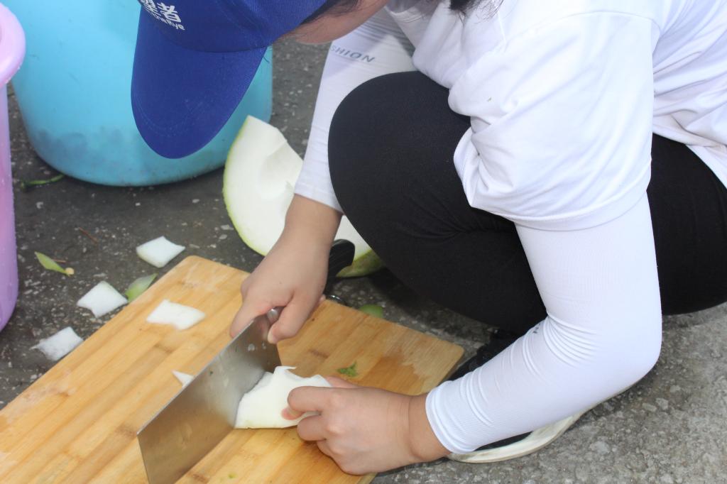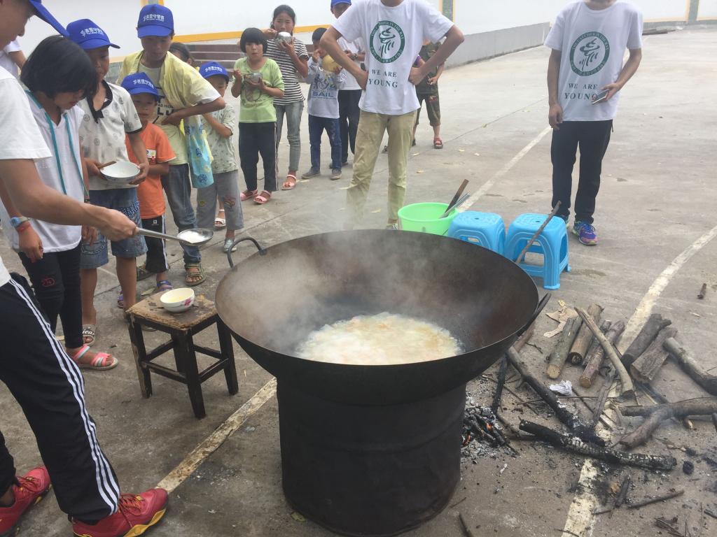 而校园的另一端,炊事班已经忙碌许久,做完志愿者的早餐后,紧锣密鼓地开始准备今天的“爱心午餐”。中午时分,学生们拿着自己的碗筷秩序井然地排队等待志愿者们分发饭菜,品尝后学生脸上露出了快乐的笑容,并对支教队老师辛苦劳作表示感谢。