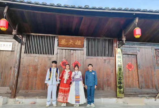 桑植县刘家坪白族乡位于湖南省张家界市,是白族与土家族等多个少数民族和谐共居的地方,这里汇聚了丰富多彩的民俗文化,形成了独特的文化景观。实践队员利用空闲时间,试穿民族服装,切身感受民族服饰与现代服饰在风格、工艺上的显著差异。