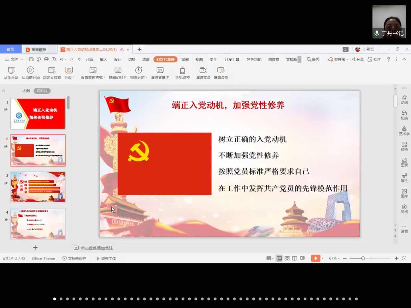 在4月26日举办的开班典礼上,学生党员代表、电气学院湖北学生临时党支部书记袁雨薇做代表发言并分享了她在抗疫期间的经历感悟,电气学院党委副书记陈仁凯围绕“如何在疫情影响下上好党课”的话题对学员提出要提高自觉性、深入理解课程内在逻辑关系的要求。院学生党总支副书记邵巧艳解读了培训班管理条例并强调大家要端正态度,在学懂、弄通、悟透、做实上下功夫。