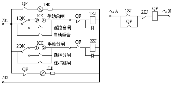模拟断路器QF(8个)采用额定电压为400V、工作电流大于30A的三相交流接触器模拟,模拟断路器能通过就地手动开关和远方遥控进行分合闸,模拟断路器的就地手动开关边上配“就地”、“遥控”切换开关,就地手动开关下方配红、绿灯指示(红灯表示合,绿灯表示分)。模拟断路器控制回路: