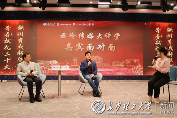 开幕式后,云岭传媒大讲堂正式开讲。本次讲堂邀请了湖南卫视频道声音形象代言人丁文山和湖南红网新媒体集团编委、理论评论中心主任王小杨作为嘉宾,分享他们在媒体从业多年的经验,并与同学们现场互动交流。丁文山以《声音之路知与行》为主题,从自身26年的从业经验出发,通过讲述亲身经历,播放实录配音作品,向同学们分享了自己的坚守与初心。他表示,每个人的成长会经历自我、精进、挥洒三个阶段,并亲切寄语与会同学去追逐光,成为光,去点亮自己,照亮时代。王小杨则与同学们共同探讨了“全媒体时代的新闻评论写作”。他向同学们详细讲解了全媒体新生态下新闻评论写作的机遇与挑战,强调全媒体时代是“观点为王”的时代,希望同学们加强评论写作训练,培养自己的批评性思维,更从容地面对未来职业生涯的挑战。