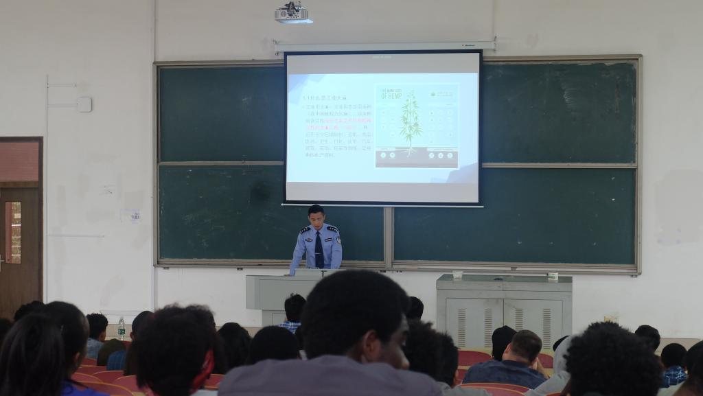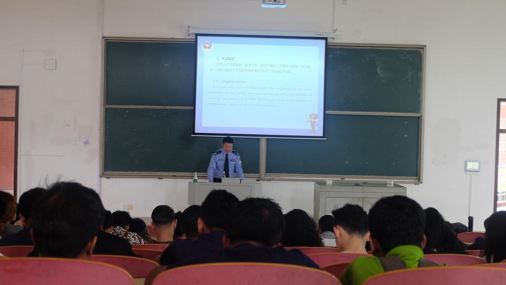 首先,长沙市公安局人口与出入境管理支队外管大队陈军警官就留学生相关的涉外法律法规,从出入境、居留、法律责任、驾车等方面,结合相关事例,为同学们进行了详细的讲解,并提醒同学们认真遵守中国法律,注意在校和出行安全。