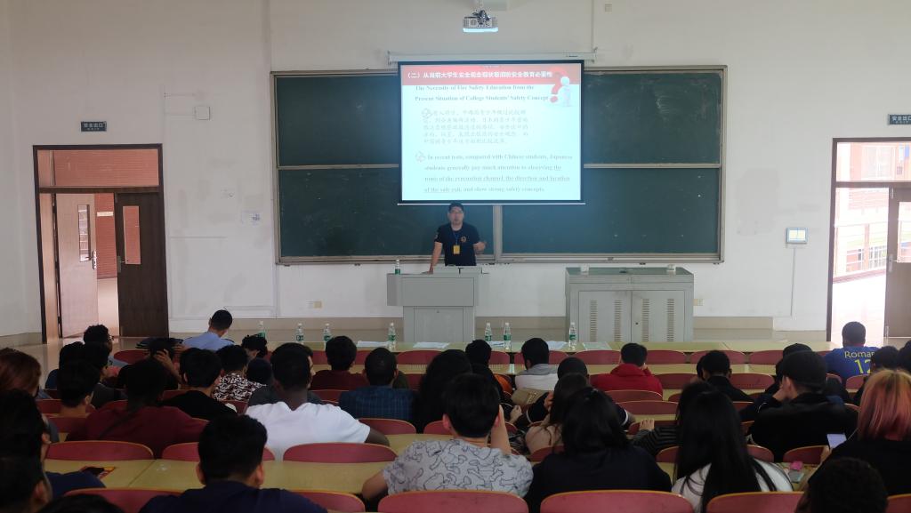 为进一步增强来华留学生的法制观念,提高安全防范意识,自觉遵守法律法规和学校的规章制度,国际学院于5月14日开展了“法制、禁毒、消防”安全专题知识讲座,讲座由国际学生工作办公室王荟惠老师主持,国际学院党总支副书记兼副院长吴振华、国际学生工作办公室全体老师及来自42个国家300多名留学生参加了本次讲座。