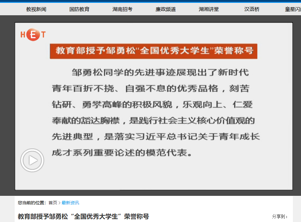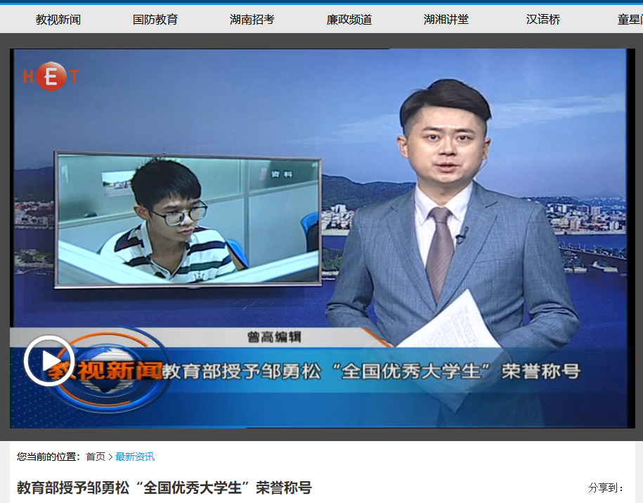 湖南教育电视台:教育部授予邹勇松“全国优秀大学生”荣誉称号