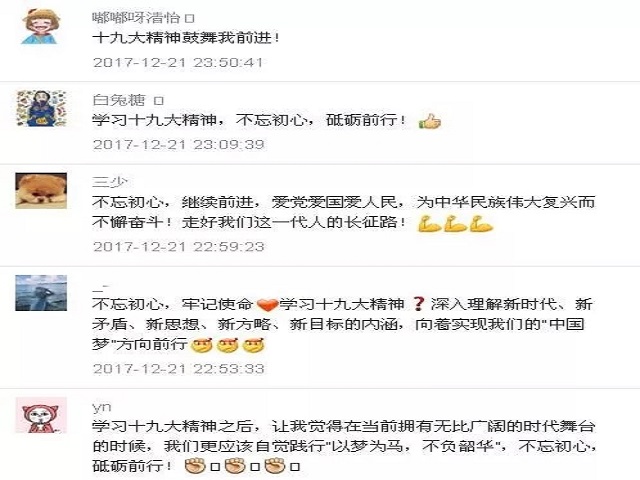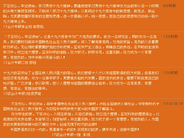 学习活动从11月28日开始至今,历时近一个月,共收到研究生党的十九大精神学习心得47篇,学习活动开展视频5个。最后,遴选出来自涂磊、关艳、董洁、彭纯、毛敏五位党员同志的优秀学习心得及优秀支部学习视频在党建博客及“经管研苑”公众号上进行推送,供大家相互学习与讨论。