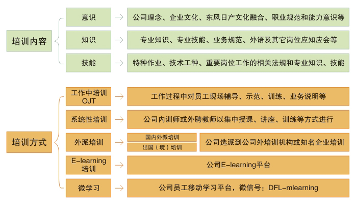 东风汽车有限公司拥有丰富的培训资源、完善的培训体系和多样化的培训方式,根据员工的特点和职业生涯规划,为其定制个性化的培训。公司每年除了按工资总额计提培训经费外,还以专项资金投资培训阵地建设,以总裁特别奖和专项奖奖励优秀内训师、优秀课件和优秀成果(培训项目、课题)等。