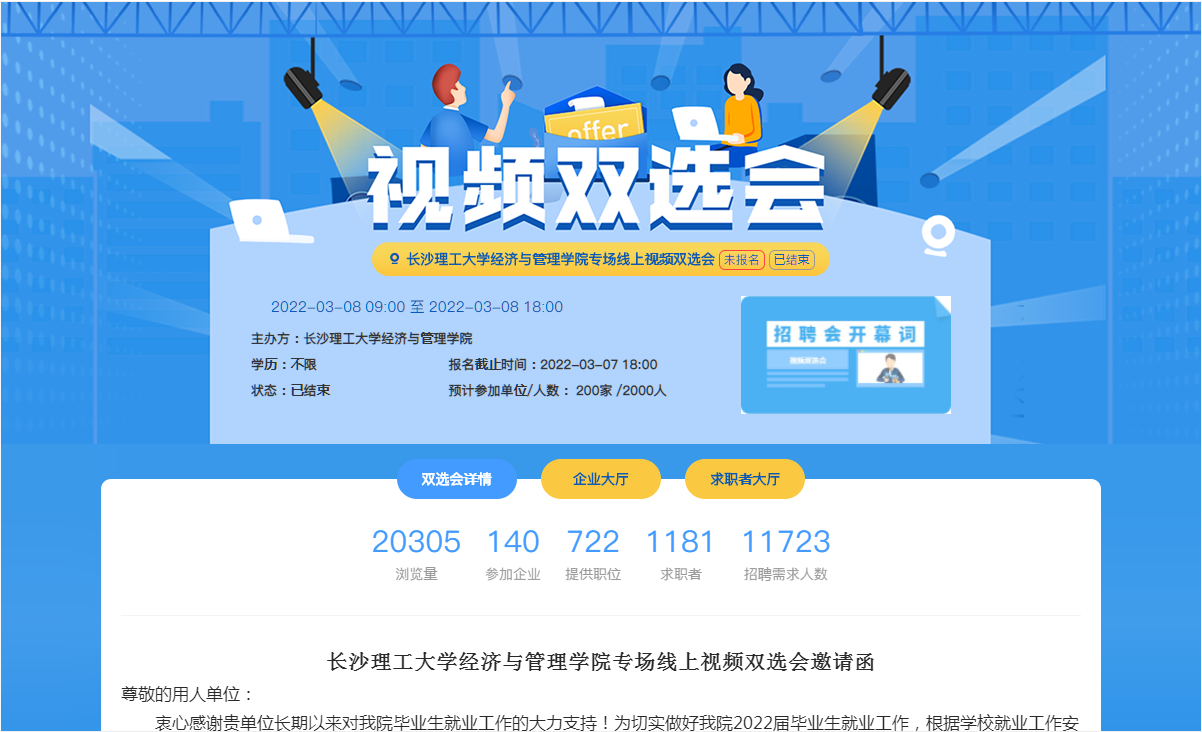 为切实做好疫情防控下2022届毕业生就业工作,不断促进毕业生好就业、就好业,抓住求职关键期,经管学院于3月8日依托云就业服务平台成功举办春季学期2022届毕业生线上视频双选会。