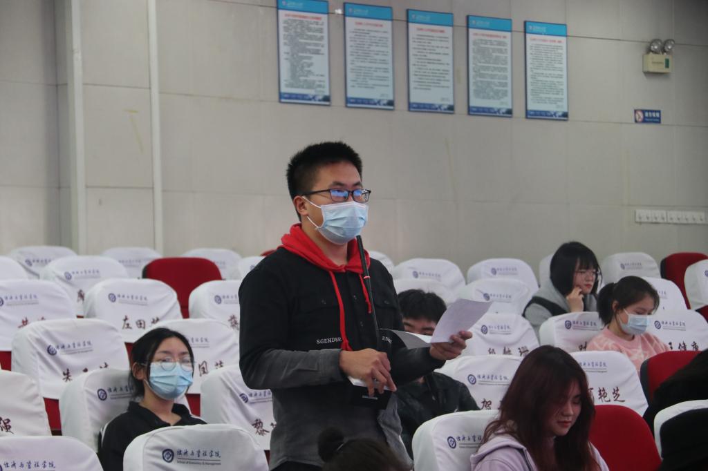 “走心”——交流“两会”学习心得。在交流发言环节中,同学们分享了自己的学习心得,和今年“两会”中最触动自己的地方。会计2104班赖剑铭分享到,此次两会关注最多的是与生活息息相关的房价、教育和就业三方面,大学生应该了解就业市场,早做规划意识。财管2002班王瑞涵则在谈及“两会”的意义时表示,两会的召开为我国未来的经济建设指明方向,为我们展现了一个宏伟蓝图,我们应当积极进取,为实现个人的发展和国家的发展贡献自己的一份力量。会计1904班张鸿杰结合暑期实践经历和“两会”内容谈到了粮食安全和乡村振兴。