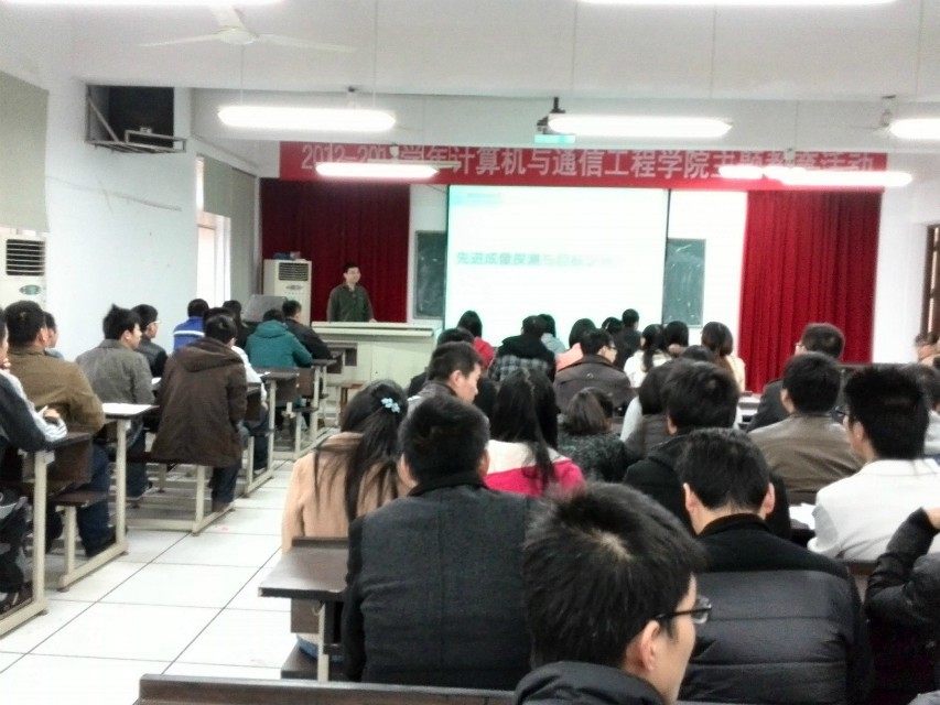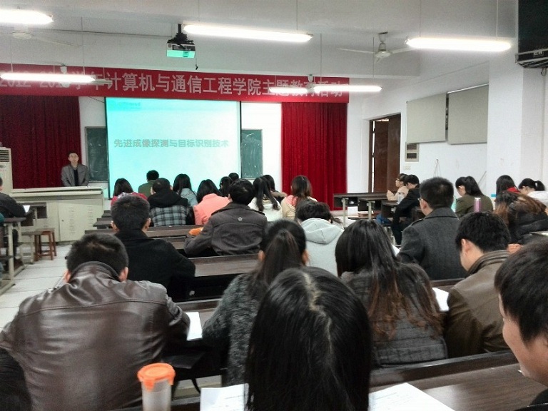 整个报告从“红外成像探测技术背景及应用”、“红外成像探测技术”、“红外成像目标识别技术”、“红外成像探测技术的发展趋势”、“激光探测技术”、“多光谱成像探测技术”、“基于幸运成像高速目标探测技术”、“红外偏振成像探测技术”八个方面进行。王教授用生动的实例重点讲解“红外成像目标识别技术”、“红外成像探测技术的发展趋势”。王平教授在讲解过程中将大家所学专业知识---图像处理相结合,使在座的同学们听起来更易于理解和明白。同时王教授也分享了自己的经历:“研究生学习一定要脚踏实地,面对看起来复杂高深的研究不要害怕,只要努力钻研,慢慢的就会了”。随后我院王威博士做了生动的总结。