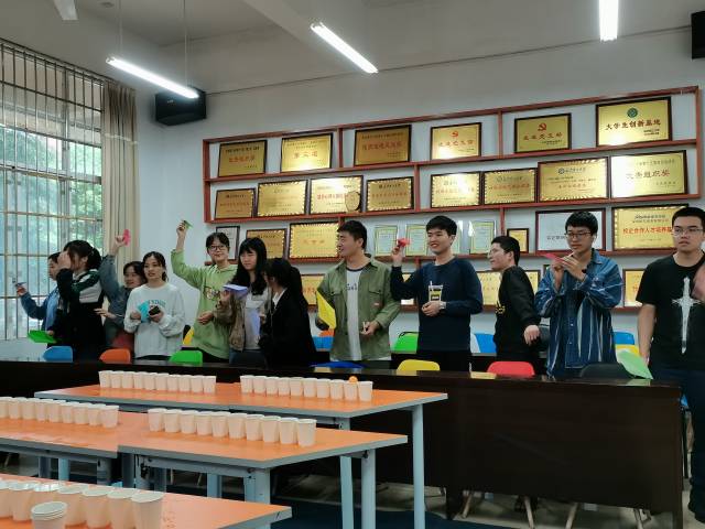本次活动包括三个环节,分别是“直面压力,笑对挫折”吹乒乓球活动、朗读活动和“放飞烦恼,拥抱自我”纸飞机活动。第一个环节是吹乒乓球小游戏。桌上依次竖排放着十个等高的一次性纸杯,参赛者要将乒乓球从第一个杯子吹向第二个杯子,一个接一个地吹,直到从最后一个杯子吹出,用时最少的组获胜。随着比赛的开始,同学们各显神通,小小的乒乓球在他们的掌控下有序地滚动着。在吹的过程中,掌握吹的技巧非常重要,有的选手鼓着腮帮子,进程顺利;有的选手费了很大的劲,但依然没能把乒乓球吹入杯子里。大家被溅得满脸都是水,现场欢声一片。第二个环节,每组派出一位成员讲述、回顾自己的大学生涯。最后一个环节是放纸飞机小游戏。同学们把烦恼与挫折写在纸上,再将纸折成纸飞机按次序放飞。小小一张纸,承载着沉甸甸的情感,在放飞纸飞机的同时,也希望烦恼随风飘去。此环节适当疏解了我们的情感,缓解了我们对未来的迷茫不安,让我们的生活更加积极向上。