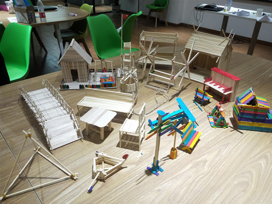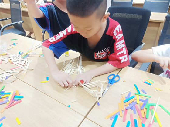 课堂开始,志愿者老师们将自己做好了的模型放在讲台上,孩子们立刻兴奋起来,迫不及待地参考老师的模型认真搭建着。孩子们发挥各自的想象力,将雪糕棍搭建了一栋栋精致的小木屋、一架架牢固的小木椅以及一个个美丽的小风车,明白了废弃的雪糕棍也可以成为搭建模型中最重要的一部分。志愿者陈羽丰表示:“课堂中,孩子们不仅体验到了自己动手的乐趣,还明白了构建模型的基本原理,这也是我们开设这节课堂的意义。”课后,不少孩子仍然意犹未尽,和老师一起完成了最后的作品,并带回家给家长们欣赏。