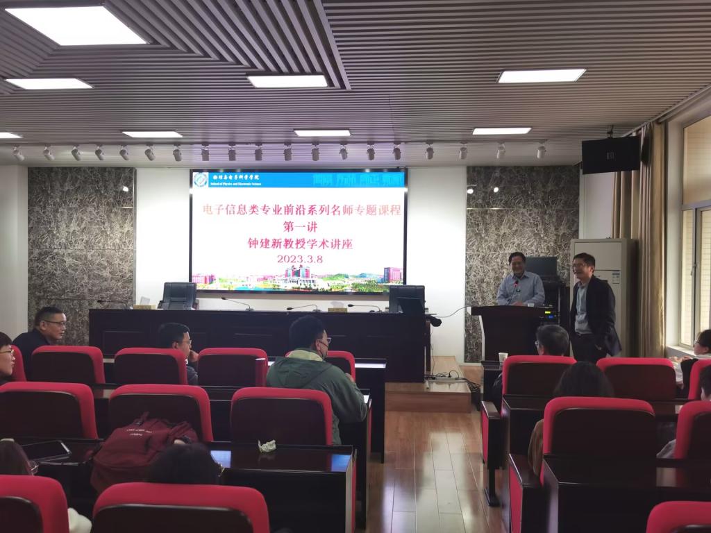 物理与电子科学学院“专业前沿系列名师专题课”于3月8日15点30分在云塘校区理科楼B-413拉开序幕。湘潭大学钟建新教授应邀来威尼斯官网作为课程第一讲的主讲人。学院党委书记张国强、副院长(主持工作)张卫兵、副院长范志强、校督导团团长唐立军教授,与电子系的师生们共计120余人一起聆听了专题课程。专题课由物电学院副院长(主持工作)张卫兵主持。