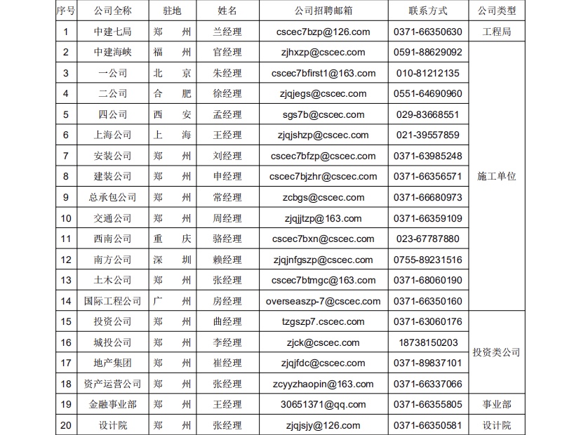 或者可以直接通过发送电子版简历至中建七局招聘官方网站 (http://cscec7b. zhiye. com/)校园招聘版块,注册选择心仪的公司即可,中建七局金牌招聘团队竭诚为你服务。.