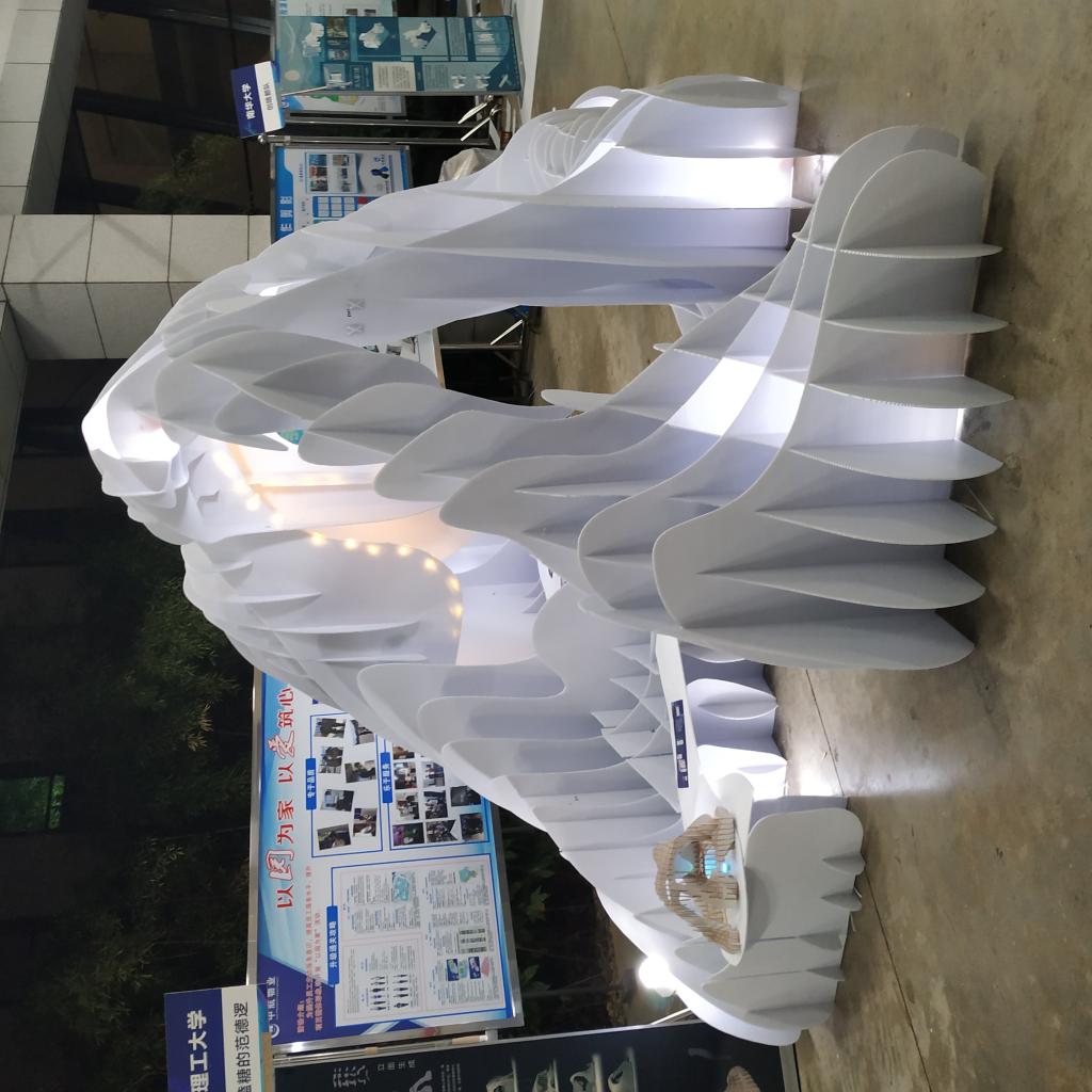 我院参赛的两支队伍及作品分别是“专注磕糖的范德逻”队建造的《星陨》和“小炒黄牛肉”队建造的《炊烟》,16名队员在周迪、何川、胡颖荭等老师的指导下,通过院内选拔、持续改进、修改完善,经过二十多个昼夜的奋战准备后,在长沙规划展示馆用近10个小时的时间,建造了两个丰富、灵动、多样的创意空间,获得了现场观众、评委及网络的广泛好评,其中《星陨》脱颖而出,获得二等奖。