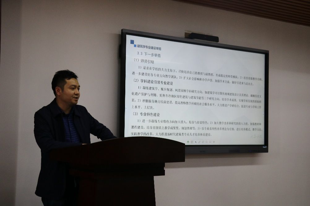 会上,许建和院长首先对建筑学专业评估基本情况进行了介绍,指出当前专业评估的现况、专业复评整改的现状以及所采取的主要举措,同时指明下阶段将重点从师资引培、学科建设引领专业建设、专业特色建设三个方面下功夫;熊鹰院长回顾了八月份进行的模拟评估,指出将举全院之力做好这项中心工作,迎接好明年三月份的再次评估。