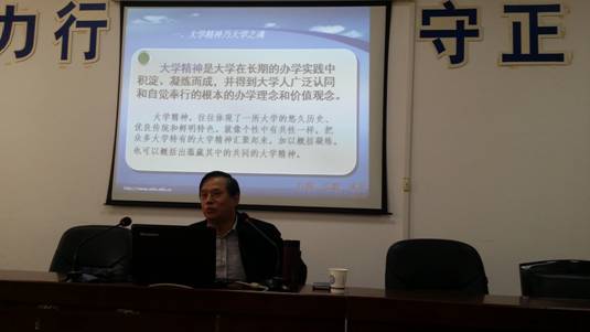 首先,骆教授借用清华大学老校长梅贻琦提出的“所谓大学者,非谓有大楼之谓也,有大师之谓也”的著名论断切入大学精神,进一步指出“大学文化是大学维系发展的命脉之所在”,校风、学风和教风是展现师生员工的精神风貌、支撑起大学的精神家园和提供了学校发展的力量源泉;进一步从大学与社会、管理者和教育者、教育者和受教育者三个价值向度进行论证,引用国内外20多所著名大学的校训旁征博引,剖析大学精神的内在实质和深刻意蕴,高度凝练出40字,“爱国奉献、服务社会、自强不息、追求卓越、求真崇真、勇于创新、兼容并蓄、学术自由、厚德载物、敦品笃行”,描绘出集个人责任、社会担当和国家使命的“三位一体”的宏大气象;同时结合自己在武大30余年的工作经历,尝试解答“钱学森之问”、“李约瑟之谜”和“中国时代之惑”,思想深邃,意味深长,催人上进。