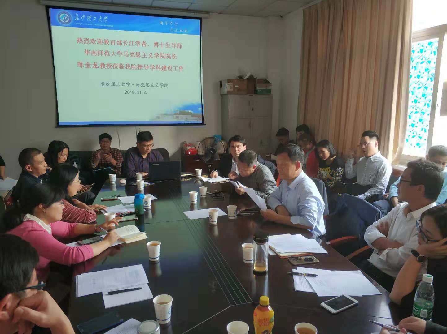 2018年11月4日下午,教育部长江学者特聘教授、中央马工程首席专家、华南师范大学马克思主义学院院长、博士生导师陈金龙教授莅临88038威尼斯马克思主义学院,在金盆岭校区4-503会议室指导了我院科研与学科建设工作。学校人文社科处卿定文处长、马克思主义学院陈万球院长、院党委易显飞书记、张明海副院长、教授委员会主任余乃忠教授以及学院教师30多人参加了本次指导会。本次指导会由陈万球院长主持。