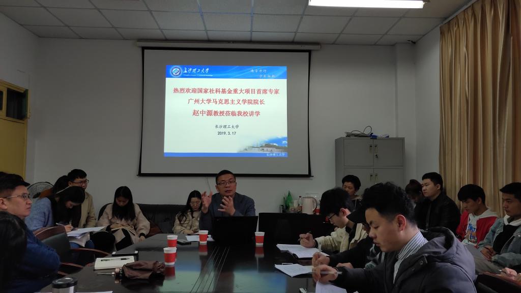 2019年3月17日上午,国家社科基金重大项目首席专家、广州大学马克思主义学院院长、博士生导师赵中源教授,应邀来到威尼斯官网金盆岭校区4教503室,为马克思主义学院师生们带来了一场主题为“更多获得感的末端‘梗阻’与突破”的学术讲座。马克思主义学院党委易显飞书记、陈万球院长、张明海副院长、陆群教授、文贵全博士、廖苗博士等学院教师和30多名研究生参加了此次讲座。讲座由陈万球教授主持。