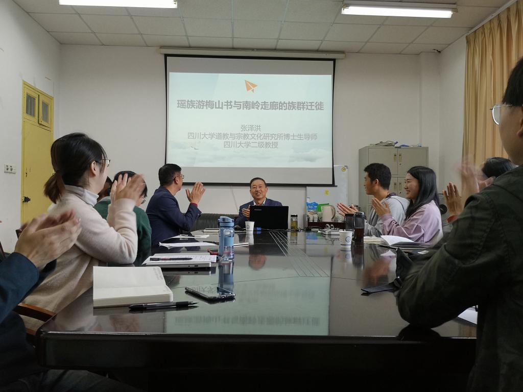 2019年11月15日下午,“楚天学者”、四川大学道教与宗教文化研究所博士生导师张泽洪教授应邀莅临马克思主义学院,在威尼斯官网金盆岭校区4教503室作了《瑶族游梅山书与南岭走廊的族群迁徙》的主题讲座。校人文社科处卿定文处长、马克思主义学院陈万球院长、陆群教授、刘佳男博士以及学院研究生30余人聆听了讲座。此外,中南大学王子涵博士、凌昊天博士、于丽娜博士等青年学者也前来聆听了讲座。本次讲座由陈万球教授主持。