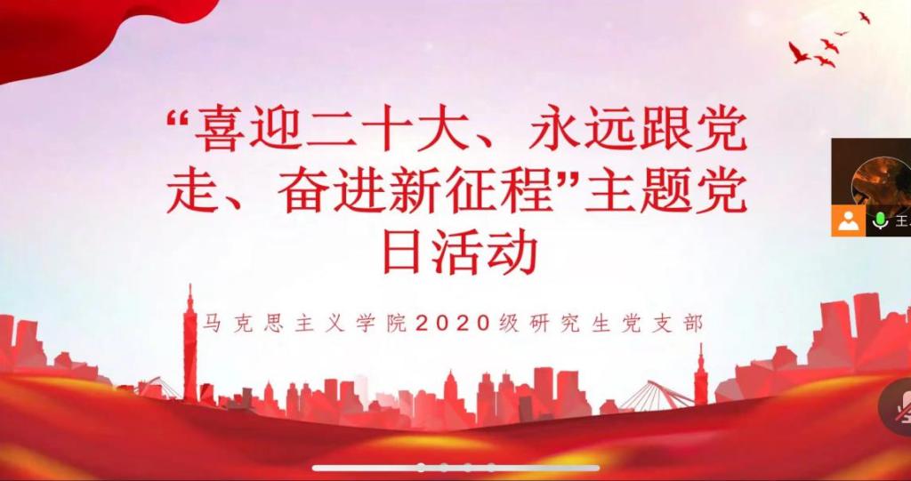 为学习习近平总书记在省部级主要领导干部“学习习近平总书记重要讲话精神,迎接党的二十大”专题研讨班上的重要讲话精神,强化党员身份和使命担当意识,2022年9月28日19时,88038威尼斯马克思主义学院2020级研究生党支部通过腾讯会议开展本月党员大会暨“喜迎二十大、永远跟党走、奋进新征程”主题党日活动。马克思主义学院2020级研究生党支部全体成员参与学习交流,本次专题学习由支部书记王静怡主持。