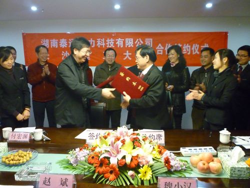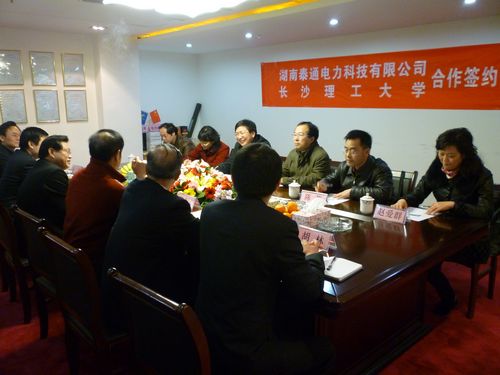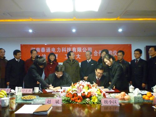 副校长付宏渊、科技处副处长刘永乐、陈荐、能动学院院长黄竹青、师资处副处长赵爱群、湖南泰通电力科技有限公司董事长赵斌、顾问魏小汉、行政副总赵捷等出席签字仪式。仪式由湖南泰通电力科技有限公司行政副总赵捷主持。
