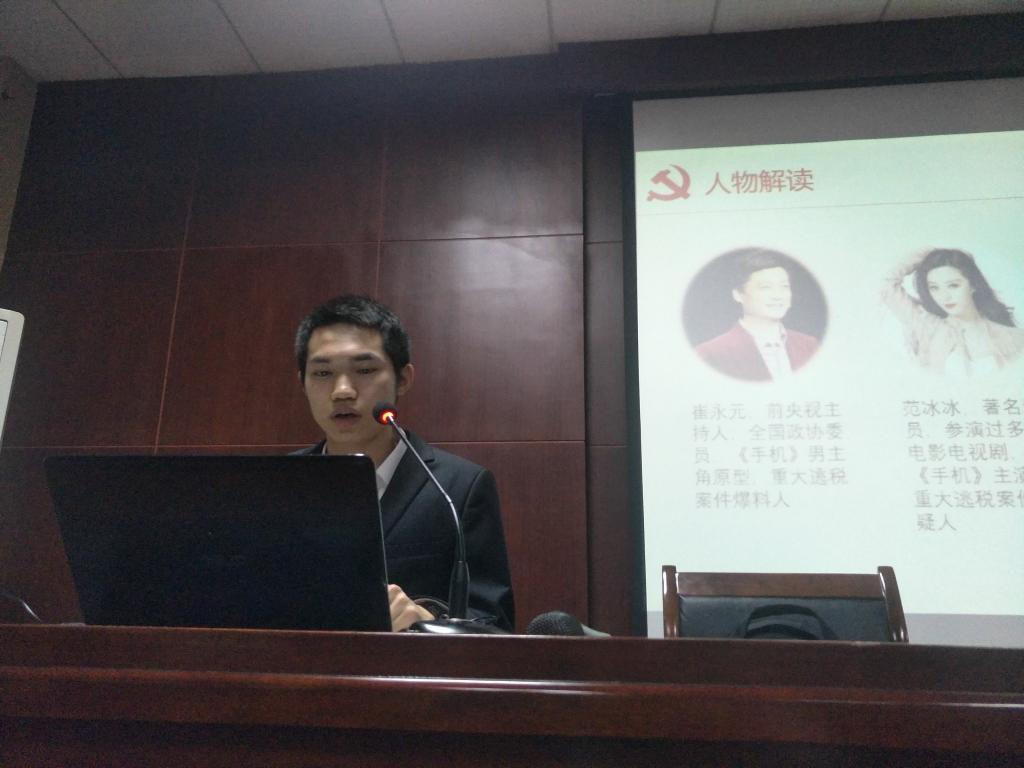 10月23日,能动学院于工科一号楼A428召开10月份党员论坛。会议主题围绕前一段时间,在社交媒体上引起热议的推文“为国效力40年,比不上范冰冰弟弟拍照一分钟?”,本次论坛由能动学院本科生一支部副书记谢成主持,一支部唐博主讲,全体党员参会。