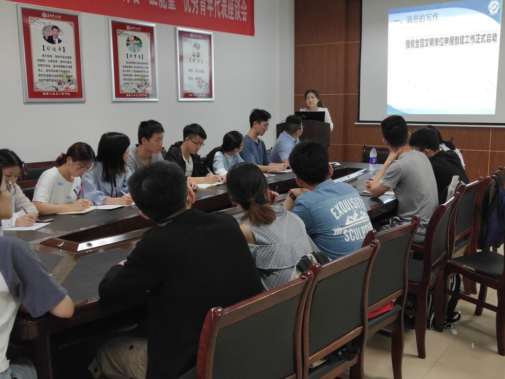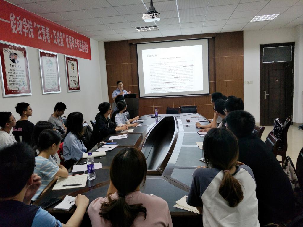 为进一步提升学生党建宣传干部的业务能力,5月4日晚上能动学院在工一A-422开展了学生党建干部培训班第四次宣传专题学习,特邀校报编辑李潇玲老师进行主讲,党建辅导员李小军老师2015级年级负责人何茂鑫以及学生党总支全体宣传干部参加。