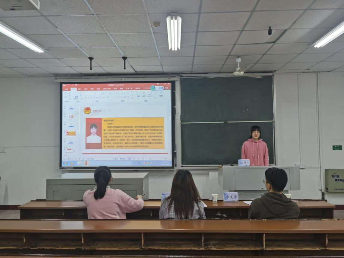 4月16日晚,能源与动力工程学院发展新团员答辩于金盆岭校区4教409顺利举行,通过新团员笔试选拔的6名同学依次进行了答辩。学工办李文豪老师、冯译萱老师担任评委。
