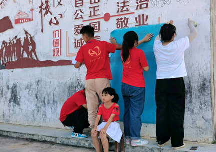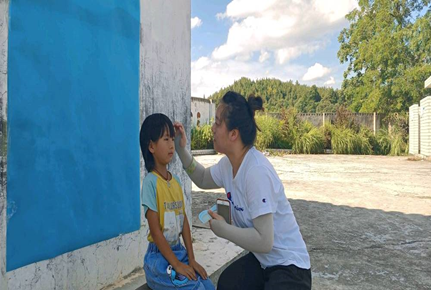 7月9日上午,一张蓝色背景布出现在澎湖小学的走廊尽头。背景布前是一张小板凳,小板凳上坐着的是正在测试拍照效果的“红烛”科普筑梦团队的老师们。