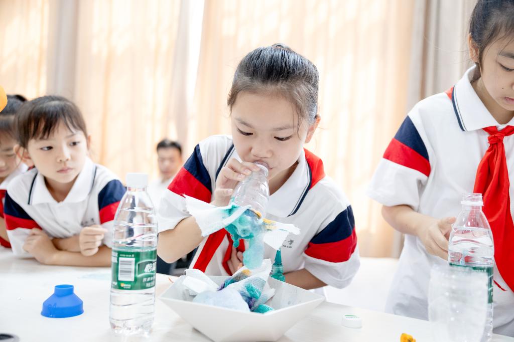 “我给大家变个魔法,让污水变成干净的水好不好?”,在科普体验环节中,志愿者们带领同学们制作了简易的净水装置,被污染的水依次通过塑料试管中的花岗岩石子、瓷石、活性炭变清澈,充分的体验到实验的乐趣,还学习了水净化的过程。“好神奇,我也会把污水变干净了”,在场的小学生开心的说道。在科学小实验“彩虹泡泡龙”中,志愿者带领同学们将洗洁精、水和白糖混合在一起,制成泡泡水并对着瓶口轻轻吹气。通过水表面的张力作用,一个个色彩斑斓、形状各异的泡泡龙便从瓶口钻了出来,引得孩子们欢呼雀跃。