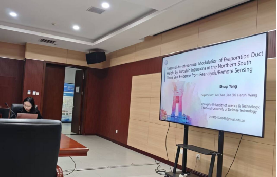 水利与海洋工程学院硕士研究生杨树琪、博士研究生张志成参加会议,就研究工作与科研问题同与会专家学者进行了充分的交流探讨。其中杨树琪做了题为“Seasonal-to-Interannual Modulation of Evaporation Duct Height by Kuroshio Intrusions in the Northern South China Sea: Evidence from Reanalysis/Remote Sensing”的学术报告,该研究是水利、海洋与大气等学科交叉融合的典型成果,聚焦于黑潮入侵对南海北部蒸发波导高度(EDH)的调制机制,提出了一种基于再分析数据与遥感数据的时空分析方法。研究通过厘清黑潮不同入侵路径(环流、跳跃、泄漏)与海气交换过程的关联,揭示了EDH冬高夏低的季节循环及其年际变异规律,为南海海洋环境感知与电磁波传播预测提供了重要的科学依据和参数支撑,获得了与会学者的热烈讨论与好评。
