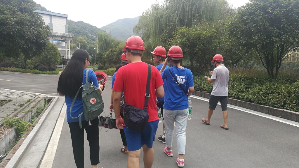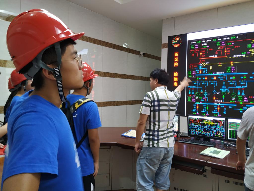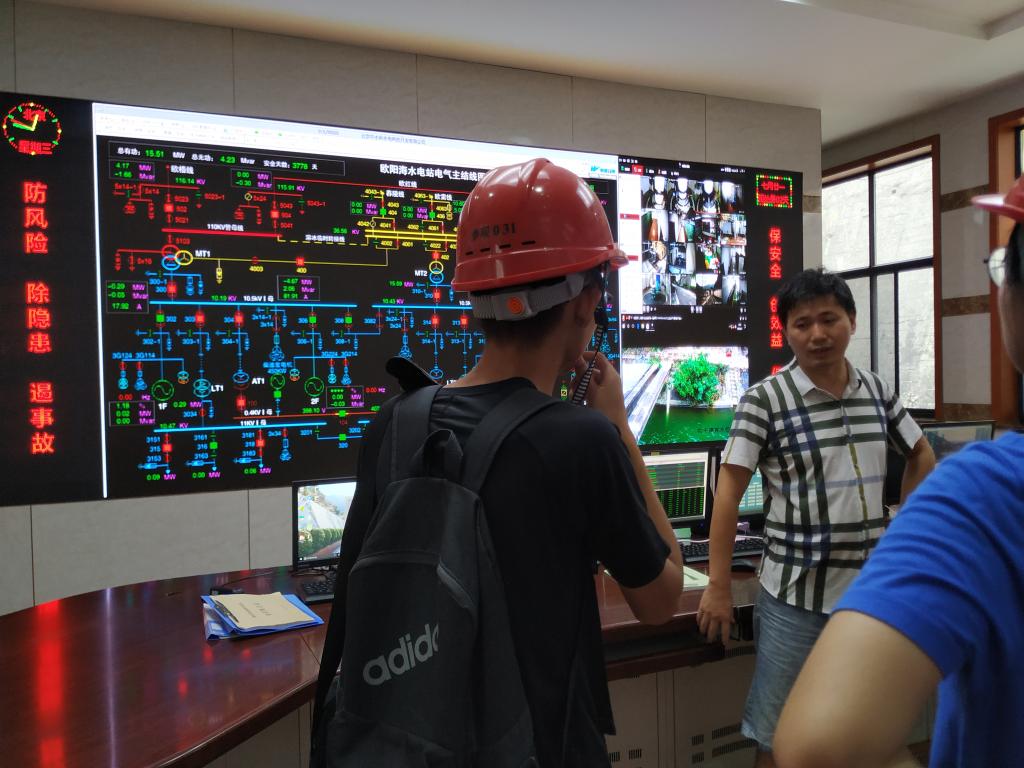 在与欧阳海水库的工作人员沟通后,实践团成员在工作人员的带领下参观了欧阳海水库大坝结构和水电站发电的原理以及机组的构造。该大坝为双曲混泥土拱坝,水电站的机组构造主要了解到有水轮发动机组、主变压器、断路器、隔离刀闸、电流互感器、避雷器。此外由于水库位于山中,实践团成员感受到了地下水的清爽。
