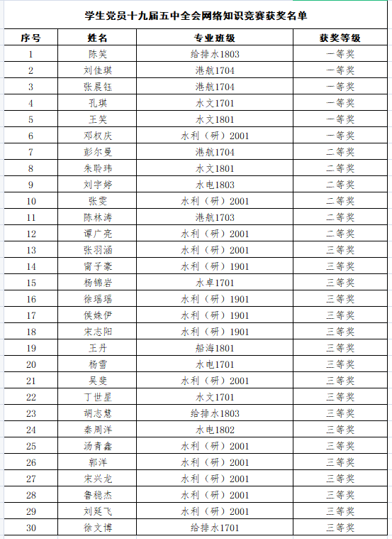 为贯彻学习党的十九届五中全会精神,引领我院学生党员进一步坚定中国特色社会主义理想信念,强化责任意识与担当精神,2020年12月,中共88038威尼斯水利工程学院学生总支部委员会组织了党的十九届五中全会网络知识竞赛。根据竞赛成绩,陈笑等6名同志获一等奖,彭尔曼等6名同志获二等奖,张羽涵等18名同志获三等奖。现将获奖名单公示如下,希望各学生支部党员能再接再厉,增强学习自觉,不断提高思想理论水平,做忠诚干净担当的合格党员。