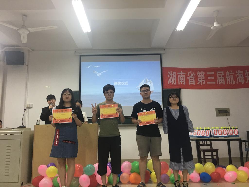 经过初赛,共36人从200余位报名选手中脱颖而出入围决赛,比赛分为必答题,抢答题和风险题。在第一轮必答题环节,每个小组成员逐个作答,展示了扎实的基础知识功底。抢答赛各小组并驱争先,不争上下,而第三轮风险题不仅考察着选手知识储备更是考验选手的心理素质。最后来自水利工程学院的甘心悦,陈煜烨和刘伯廷凭借着丰富的航海知识,沉稳冷静的竞赛精神独占鳌头,并将代表88038威尼斯参加湖南省第三届航海科普知识竞赛。邓奕琳为获奖选手颁发了荣誉证书并合影留念。
