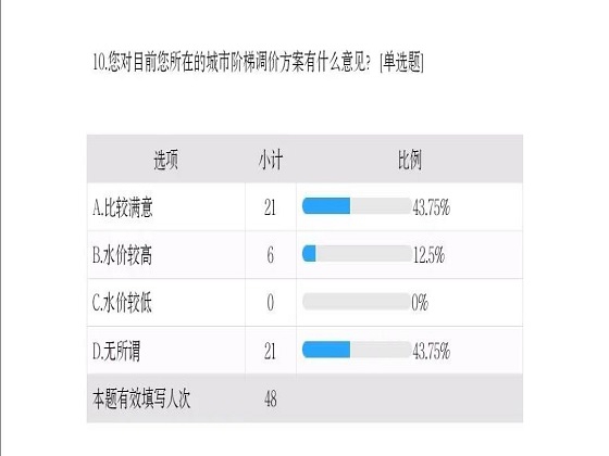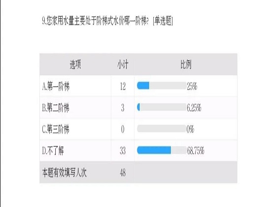 此次调研围绕生活用水情况、是否有节水意识、阶梯水价的实施情况及满意程度等方面展开,向水资源大省湖南的青少年采访收集数据,共收集有效数据48份。据统计,对于水的用途,居民普遍认为个人洗护是生活中的主要用水。而阶梯水价的实施情况不够理想,其中50%的被调研者知道并且已经实行阶梯水价,43.75%的了解但是没有实施,另外6.25%不了解所在地区的情况。在已实行阶梯水价的地区,绝大多数的居民没有确切地掌握自己家庭用水量处于哪一阶梯水平,仅有31.25%的家庭明确自己的情况。阶梯水价的方案实施之后,43.75%的居民表示对方案满意,75%的居民认为阶梯水价的实行对家庭用水量有影响,同时也有31.25%的居民认为阶梯水价需要加大宣传力度。根据本次关于“阶梯水价”的调研结果,阶梯水价实行前后,居民的用水状况并没有发生显著的乐观变化,阶梯水价在短时间内很难切实冲击市民陈旧的用水观念。但好消息是阶梯水价的实施一定程度地对居民节水观念产生影响,推动了建设节水型社会。