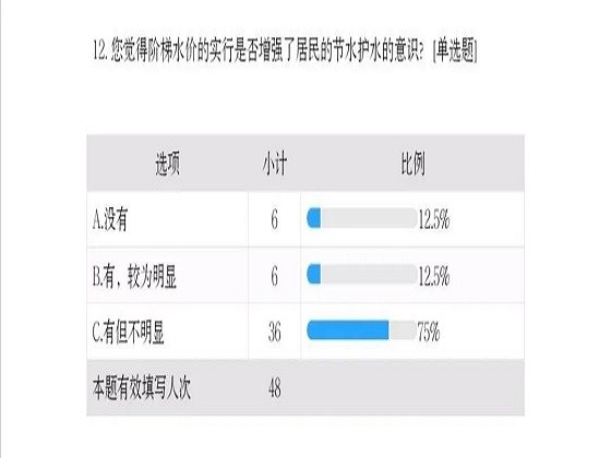 此次调研围绕生活用水情况、是否有节水意识、阶梯水价的实施情况及满意程度等方面展开,向水资源大省湖南的青少年采访收集数据,共收集有效数据48份。据统计,对于水的用途,居民普遍认为个人洗护是生活中的主要用水。而阶梯水价的实施情况不够理想,其中50%的被调研者知道并且已经实行阶梯水价,43.75%的了解但是没有实施,另外6.25%不了解所在地区的情况。在已实行阶梯水价的地区,绝大多数的居民没有确切地掌握自己家庭用水量处于哪一阶梯水平,仅有31.25%的家庭明确自己的情况。阶梯水价的方案实施之后,43.75%的居民表示对方案满意,75%的居民认为阶梯水价的实行对家庭用水量有影响,同时也有31.25%的居民认为阶梯水价需要加大宣传力度。根据本次关于“阶梯水价”的调研结果,阶梯水价实行前后,居民的用水状况并没有发生显著的乐观变化,阶梯水价在短时间内很难切实冲击市民陈旧的用水观念。但好消息是阶梯水价的实施一定程度地对居民节水观念产生影响,推动了建设节水型社会。