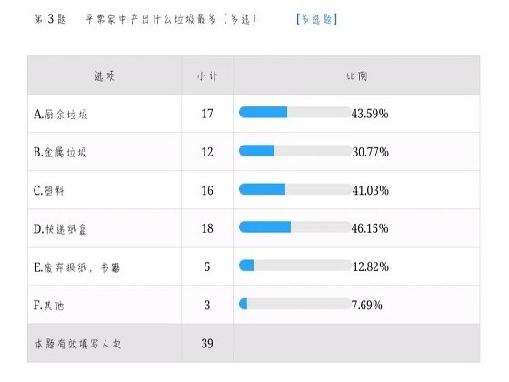 此次调研向全国各地的网民采访收集数据,共收集有效数据39份。据统计,大约有95%的人员能够了解到我国现行的垃圾分类方法,仅有5%的人员不了解。有95%的人员能分辨可回收垃圾与不可回收垃圾,说明现有的垃圾分类方法的普及效果较为良好,大部分人能够简单的区分可回收垃圾与不可回收垃圾。有80%的家庭里有垃圾分类的习惯,说明大部分家庭存在垃圾分类的意识。大约56%的人员认为影响其没有进行垃圾分类的原因是“不知道如何分类”以及“没有分类的垃圾箱”,大约30%的人员认为是“时间匆忙”以及“其他人没有分类”。这反映了当前的垃圾分类方式还需要进行大规模的宣传与引导,而垃圾分类的设施也急需完善。大约40%的人员认为最有效的宣传途径是“政府的号召与规定”。