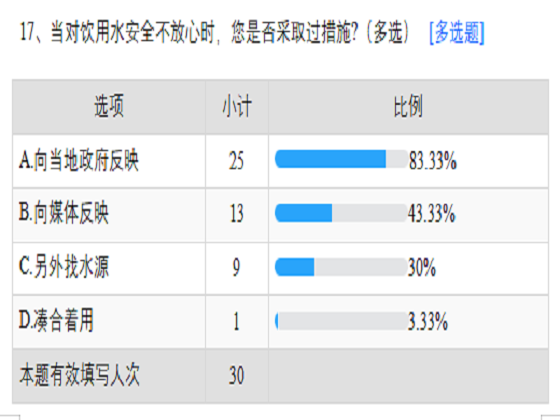 此次调研围绕农村地区饮水来源、水质、供水情况、用水质量、农村安全饮水工程建设情况及满意程度等方面展开,向多个省份不同县(区)农村地区的人员收集数据,共收集有效数据30份。据统计,农村被调查者主要饮水来源为地下水和河流水库两部分,山泉水、桶装水、矿泉水占极少数,且绝大多数被调查者一直使用地下水和河流水库水并表示此水经过处理后作为饮用水甘甜爽口、水质较佳。统计数据反映,绝大多数被调查者表示不知道当地水源所在位置且对水源污染情况了解甚少,但认为所在地区饮用水外观好、口感佳且通过自来水厂进行调蓄、消毒、净化,值得信赖。在建设农村安全饮水工程后,96.67%的人表示当地患涉水性疾病的情况、旱季用水困难的人数和农村人居环境均得到了极大改善,并已实现供水排水一体化举措,对此工程给予充分肯定,表示经过工程处理后的水质较好,在一定程度解决了农村饮水安全问题。另有83.33%的人表示在对饮水安全不放心时会积极向当地政府反映寻求改善,同时也希望可以在饮水安全工作的资金支持、设施建设、宣传力度、服务体系和技术含量等方面增大投入从而能进一步升级。