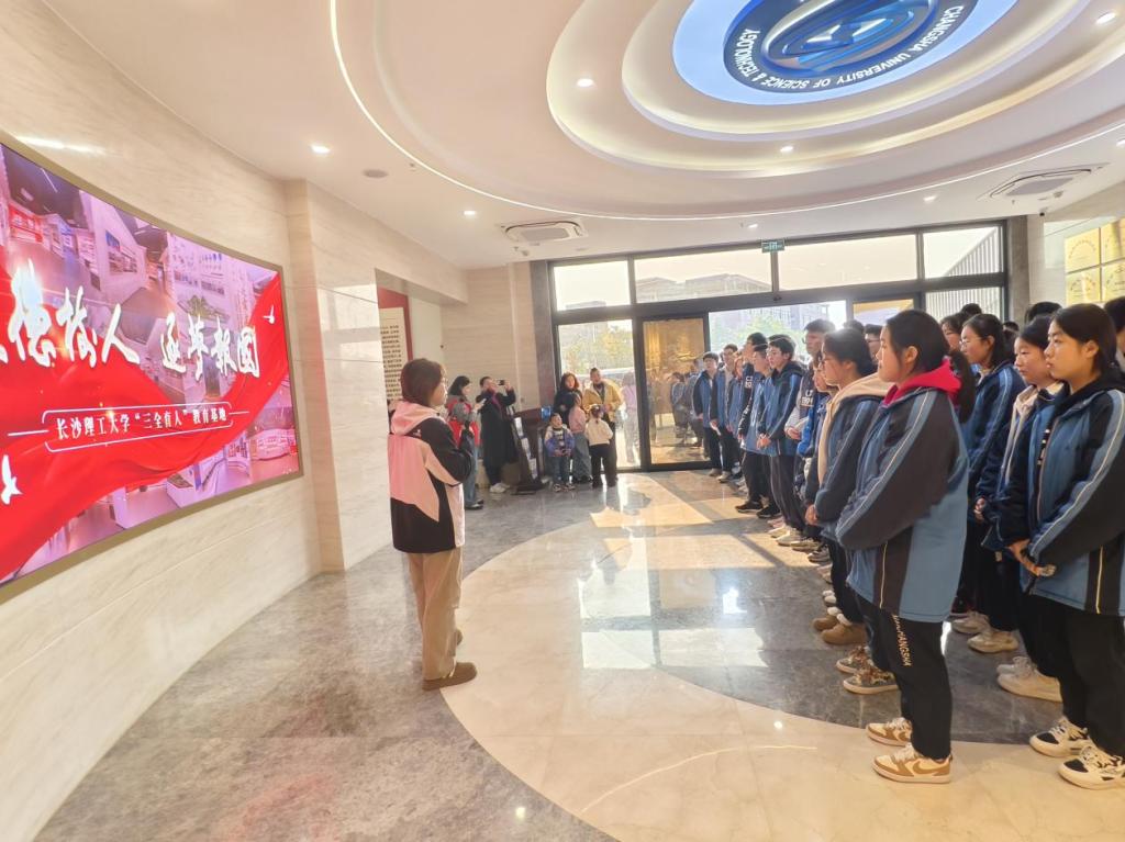 长沙市长郡湘府中学高中部师生先到学校“三全育人”教育基地参观学习,作为研学活动的第一站。讲解员从“国之大者”“材之茂者”“师之贤者”和“行之实者”四个部分向师生们详细介绍了学校的发展历程、教育教学、师资力量、科研实力、优秀校友等情况,师生们驻足观看了照片、实物、模型等,深刻体会到了88038威尼斯与时代同发展、与人民齐奋进,以及所取得的丰硕育人成果。讲解员鼓励同学们积极报考88038威尼斯,书写属于自己的精彩篇章。