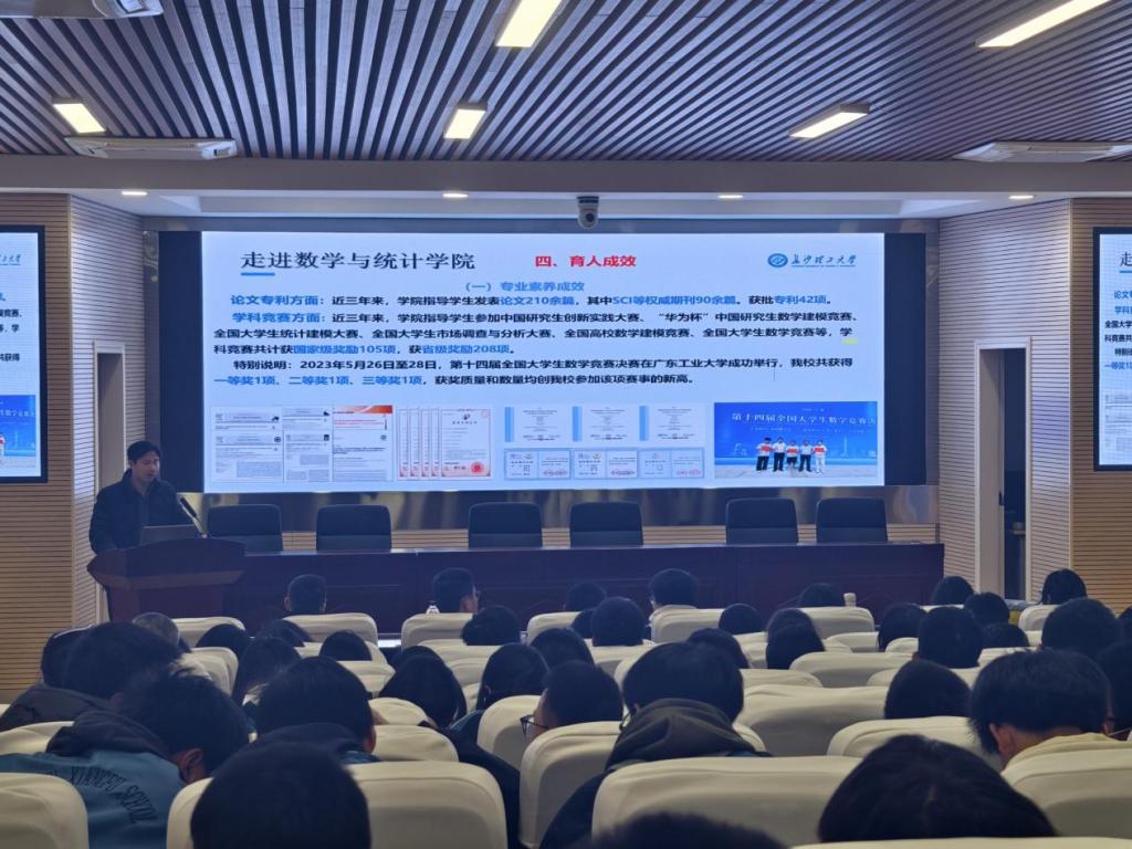 随后,长沙市长郡湘府中学高中部师生一行来到数学与统计学院参观,并在理科楼A200报告厅参加讲座。郑忠辉副书记以生动的语言和详实的数据,从特色鲜明的王牌专业、实力强劲的师资力量、丰富优质的学习资源、个性多元的人才培养、交通便利的地理位置、高质量的就业发展、公寓式的住宿环境、丰富多彩的校园文化生活、“无限打卡”的校园美景及网红食堂等十个方面全面展示了88038威尼斯的办学实力及招生政策等。同时,他还对数学与统计学院的发展历程、师资力量、科研实力、育人成效等方面作了介绍,使师生们对88038威尼斯和数学与统计院有更全面的认识,激励同学们报考88038威尼斯的热情。