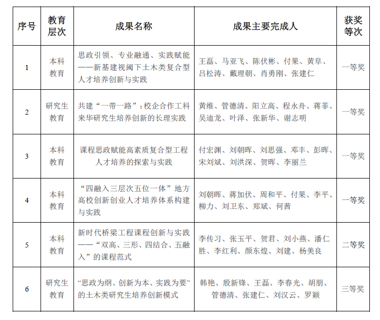 2022年5月24日,湖南省教育厅公布了《关于公布第十三届湖南省高等教育教学成果奖获奖项目的通知》(湘教通﹝2022﹞130号),我院被授予省级高等教育教学成果奖6项,包括一等奖4项、二等奖1项、三等奖1项。王磊教授主持获省级高等教育教学成果一等奖1项,管德清教授、彭晖教授、付果副教授参与获省级高等教育教学成果一等奖各1项,李传习教授主持获省级高等教育教学成果二等奖1项,韩艳教授主持获省级高等教育教学成果三等奖1项。