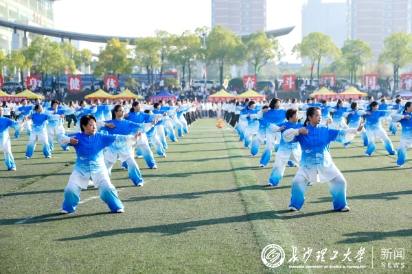 开幕式上,《薪火相传》大型团体操表演以扇为媒、以舞为语,汇成熊熊火炬,象征长理精神生生不息、创新之光熠熠生辉。同学们动作整齐、编排新颖,展现出长理学子昂扬向上的青春风采。教师方阵带来的八段锦表演,让平日里耕耘于三尺讲台的教师们走上绿茵场,以身示范,引领校园健康风尚。由各学院、各分工会基层组织组成的创意方阵精神抖擞、步伐铿锵、口号响亮,为师生们带来了精彩纷呈的创意表演。体育学院的教师们将刚柔并济的长拳、迅疾灵动的咏春、飘逸潇洒的舞剑融合,一招一式尽显深厚功底,将力与美、传统与现代完美融合,赢得了全场师生的阵阵喝彩。