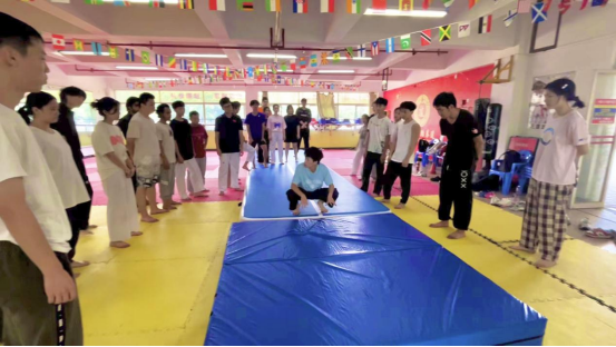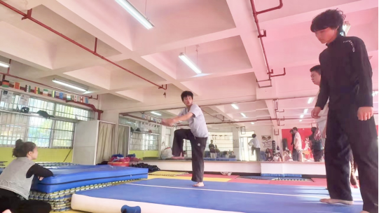 集训期间,校队教练余新畅老师和队内技术指导李键倾囊相授,将自身技术与丰富经验浓缩于这两日的集训之中,为参与者们提供专业的指导与示范,全力给予参加本次公益集训的同学技术支持。本次训练内容涵盖前、侧、后空翻技巧以及踢月的基本要领等。在确保安全的前提下,鼓励同学们尝试难度更高的特技动作,力求让每一位参与者都能在此次公益集训中收获满满。