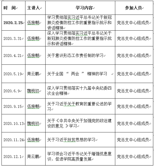 为落实学校关于《88038威尼斯2020年度两级党委中心组理论学习安排》通知的要求,深入学习贯彻习近平新时代中国特色社会主义思想,坚持思想建党、理论强党,进一步加强学院党的政治建设,提高领导班子的党性修养、政治素养和理论水平,根据当前理论学习的形势和任务,结合学院年度工作要点,现将文新系2020 年党总支中心组理论学习安排如下: