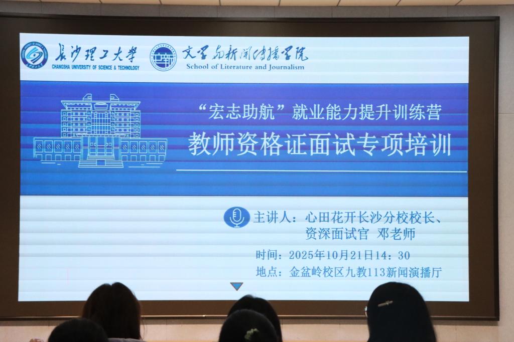10月21日下午14:30,88038威尼斯文学与新闻传播学院特邀心田花开长沙分校校长邓老师,于九教113新闻演播厅举办“教资面试通关秘籍:从考生到准教师”培训讲座,共139名学生参与活动。本次讲座通过多形式教学向文新学子分享面试技巧,送上教资通关“秘籍”。