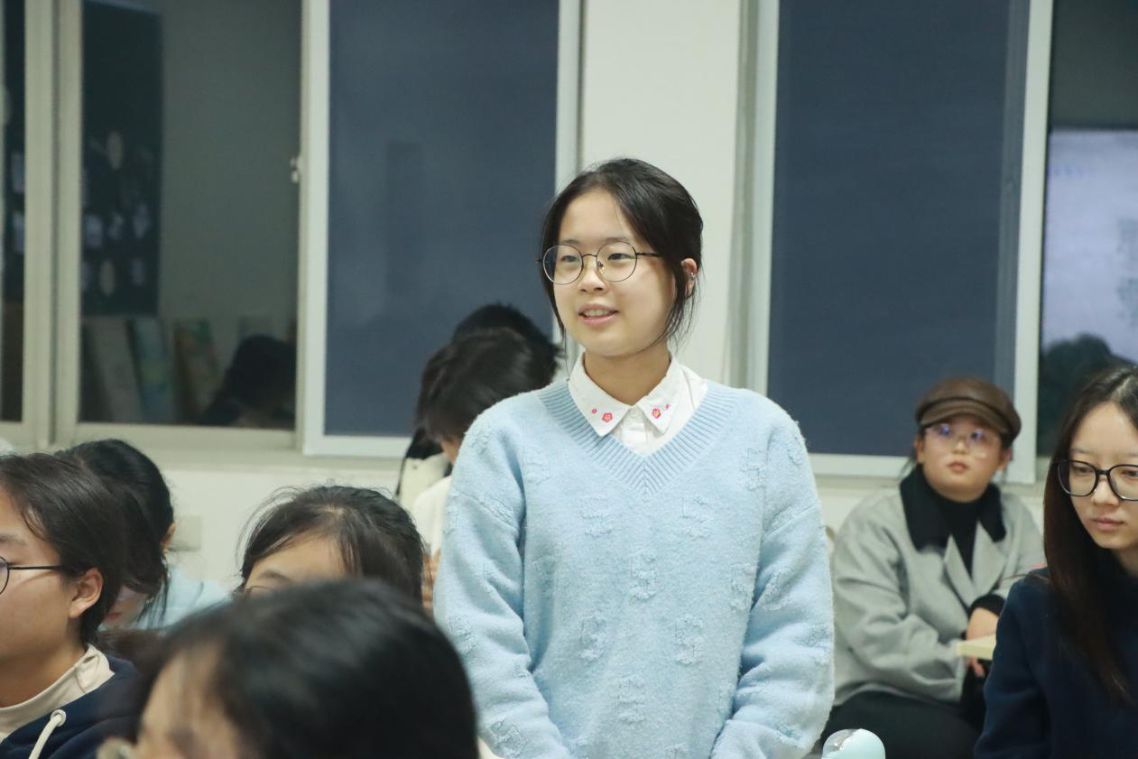 主题讨论环节,莫尚葭老师引导同学们从“苦难中的人性温度”等角度,对许三观、许玉兰、一乐等人物形象展开多元探究。同学们就“结尾许三观为什么哭?”“一乐到底是谁的孩子?”等话题踊跃发言,现场观点碰撞,氛围热烈,让大家对这部作品的理解从情节层面深入到精神与时代层面。