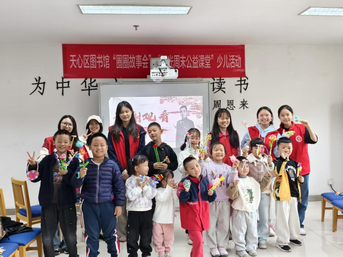 活动尾声,孩子们在志愿者老师的带领下,运用扭扭棒、黏土等材料亲手制作花束和勋章,以质朴而真诚的方式,表达对革命先辈的敬仰与追思。课堂内容环环相扣、层层深入,既关心知识传递,又注重情感共鸣。红色精神的种子在孩子们心中生根发芽。最后,志愿者们为孩子们推荐了《简爱》《稻草人》两本经典书目,鼓励孩子们通过阅读感悟善良、正直、勇敢的品质内涵,理解责任的意义,学会担当。