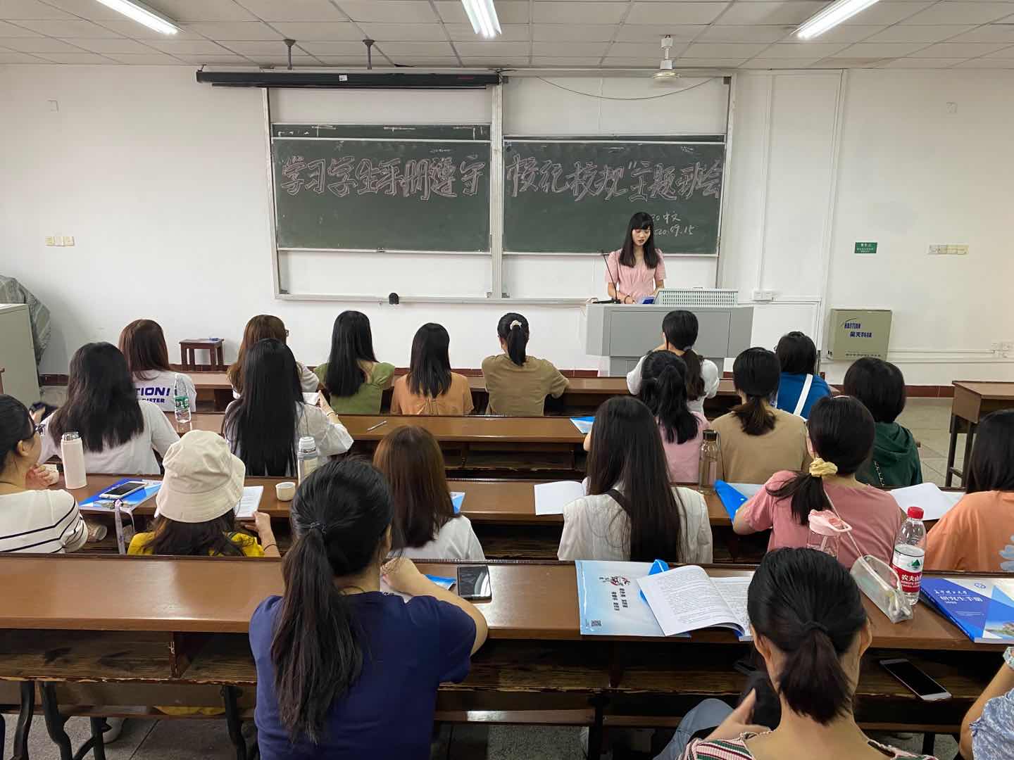 为了让同学们更好地了解学校的规章制度,进一步提高学生的守纪意识和安全防范能力,规范学生的行为举止,创建文明和谐校园。2020年9月15日,文学与新闻学院汉语言文学专业2020级研究生在金盆岭校区四教510教室开展了“学习学生手册,遵守校规校纪”主题班会。